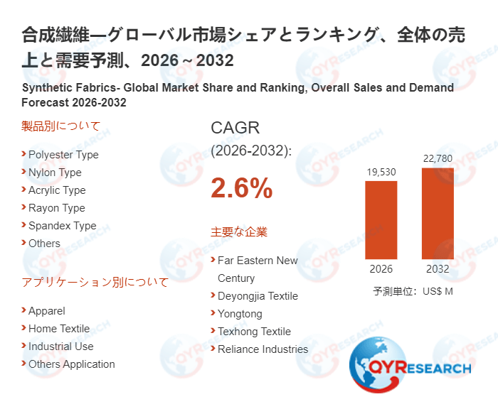 QYResearchが発表した新たな市場調査レポート「合成繊維―グローバル市場シェアとランキング、全体の売上と需要予測、2026~2032」によると、世界の合成繊維市場規模は2025年の約19080百万米ドルから2026年の19530百万米ドルへと順調に拡大すると見込まれ、予測期間中は年平均成長率(CAGR)2.6%で成長し、2032年には22780百万米ドルに達すると予測されている。
