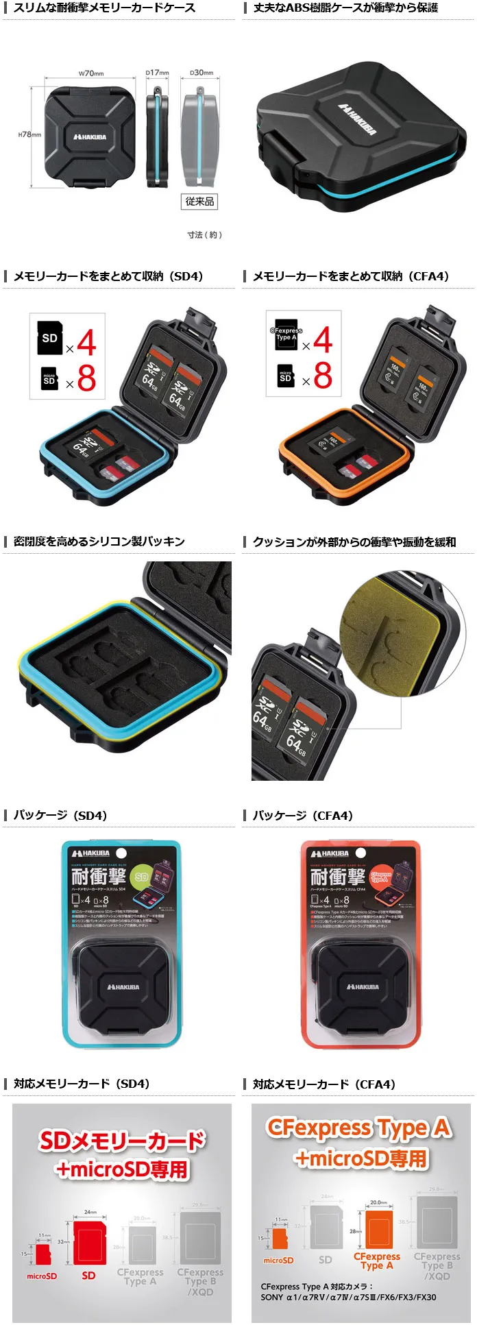 ハクバ写真産業株式会社(本社:東京都墨田区)は、従来品比約43%スリム化した耐衝撃メモリーカードケース「ハードメモリーカードケーススリムSD4(SDカード4枚/microSDカード8枚用)」、「ハードメモリーカードケーススリムCFA4(CFexpress Type Aカード4枚/microSDカード用8枚)」の2種を発売いたします。