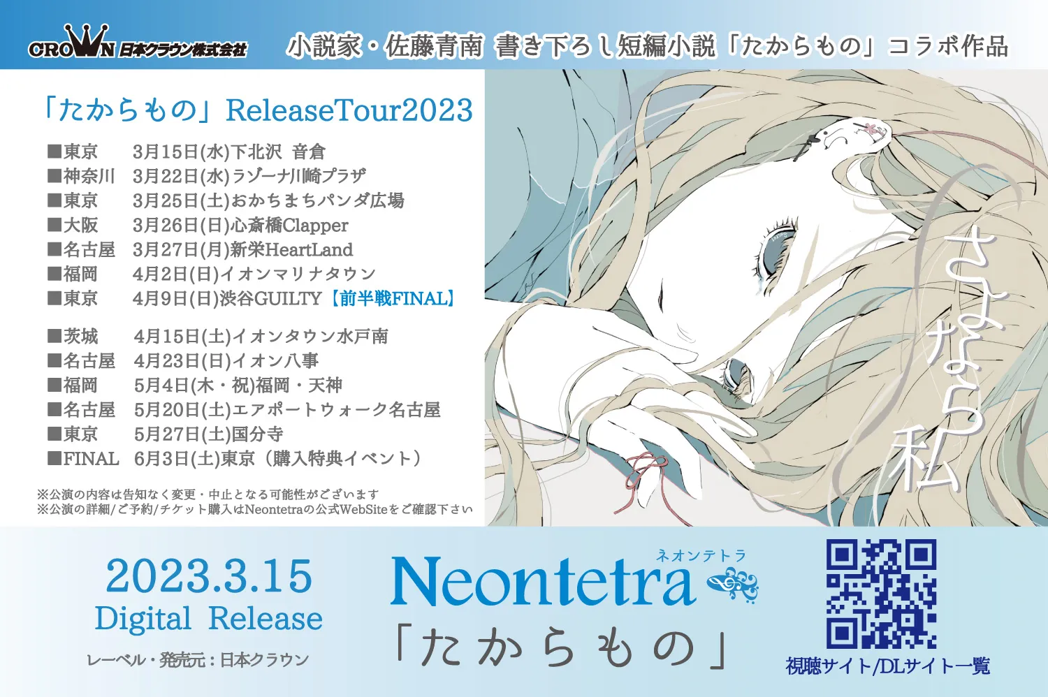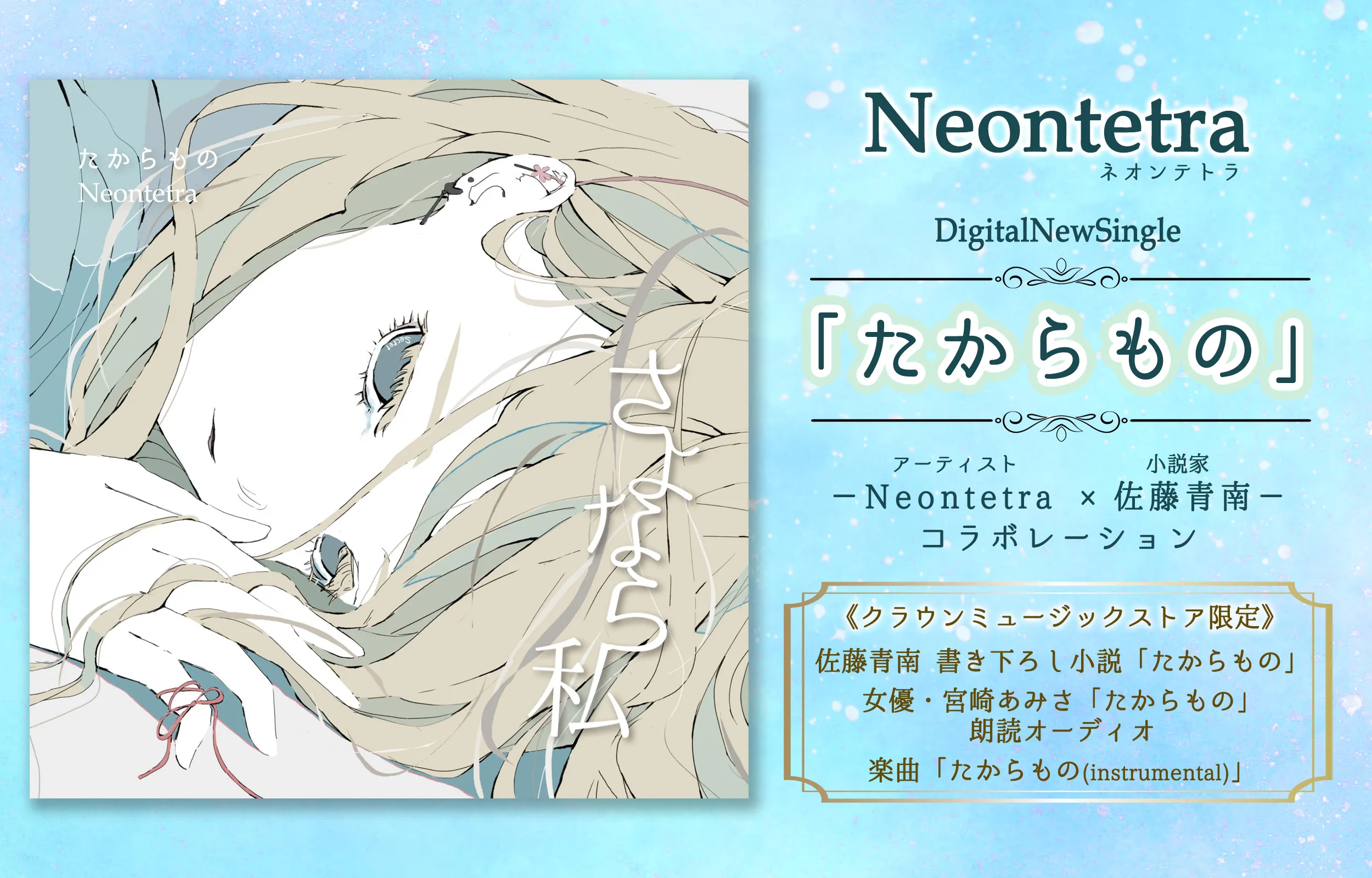さらに、「クラウン ミュージック ストア」限定商品に付いている短編小説「たからもの」朗読オーディオでは、「暴太郎戦隊ドンブラザーズ」への出演やグラビア雑誌の表紙を席巻する人気女優・宮崎あみささんが朗読に初挑戦。また、6月3日(土)昼に都内で行われる「たからもの」発売記念イベントにも、Neontetra、佐藤青南先生に加え、宮崎あみささんのゲスト出演が決定。当イベント観覧券やオンライン視聴券の特典付き商品はクラウンミュージックストア(https://crown.murket.jp/artist/17640)で本日より販売開始となりました。