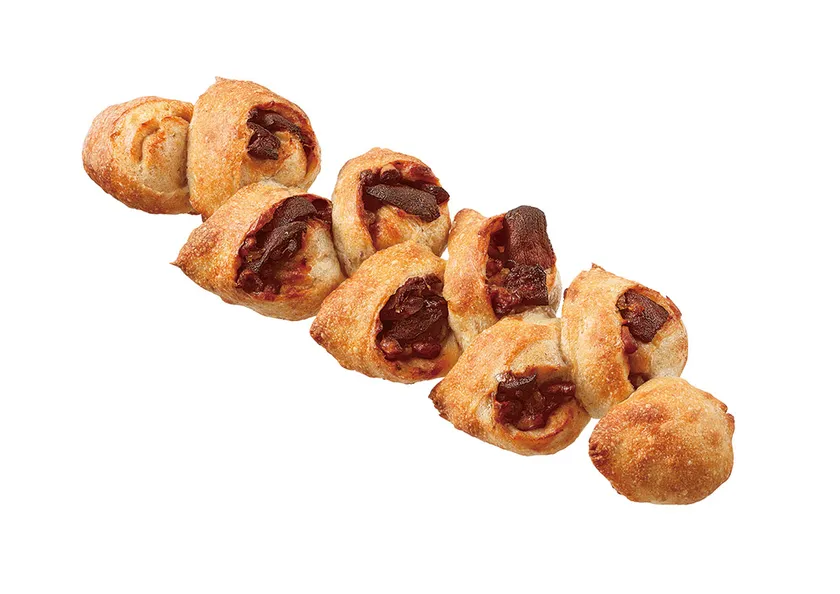 豆乳を使ったもちもち生地の厚切り、ピザソースとチーズでソーセージを抱えて焼きこみました。