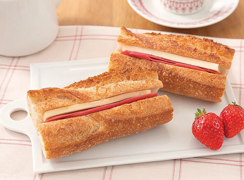 苺ショコラと無塩バターをフランス産小麦の香ばしいバゲットで挟みました。甘酸っぱい苺の風味、苺ショコラの繊細な紅色が明るい春のイメージにぴったり。