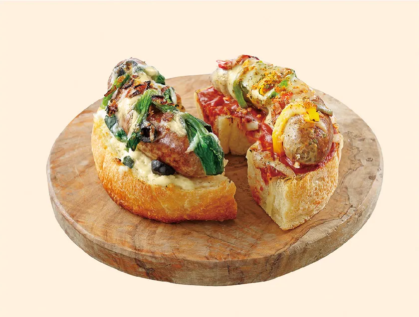 自家製ソーセージの極厚もっちりピザトースト(白・赤)各1,350円(1個)