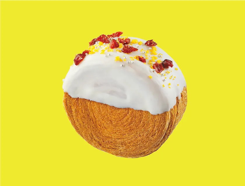 NYで流行っている、チョコでデコレーションされた丸いクロワッサン。チーズクリームとラズベリージャムを中に入れ、ホワイトチョコの上にはフリーズドライのフルーツをトッピング。