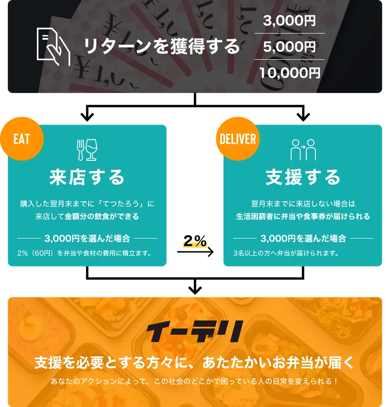 イーデリの応援者はお店が発行する1か月の間に定額範囲で飲食を楽しめる定額リターン3,000円・5,000円・10,000円からランクを選択。もし期限内に利用がなかった場合、その未使用分のリターンを翌月に弁当や食材に変えて、支援を必要とする方々に直接またはNPO団体を通じて届けます。応援者自身が飲食店で食事すること、または誰かの命を救うことを選択できます。