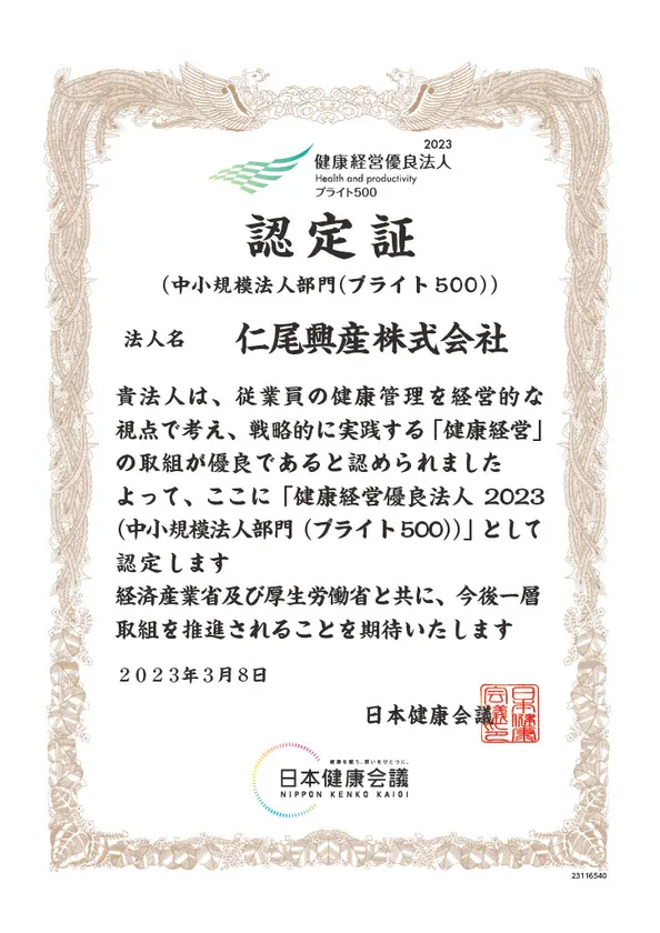 仁尾興産株式会社 認定証【中小規模法人部門(ブライト500)】