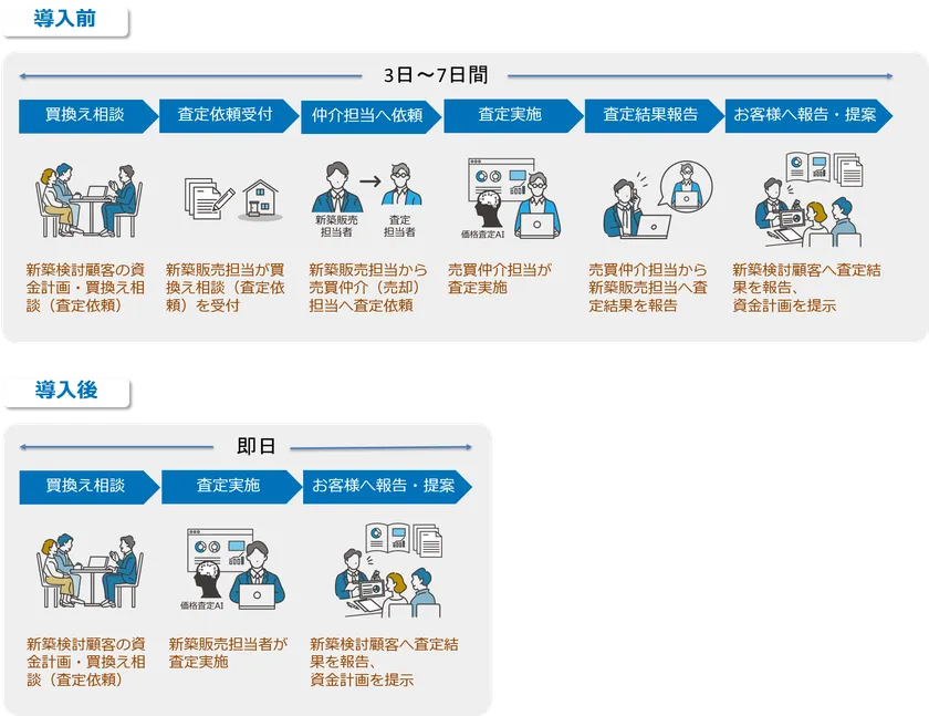 当社の新築販売においては、お客様の買換え相談に対して、新築販売担当者が直接査定業務を実施できないため、所有不動産所在地を営業圏とする当社売買仲介店舗へ査定業務を依頼し、数日から1週間後に提出された査定書を基に、お客様へお伝えするという段階的な商談スキームで行っていました。