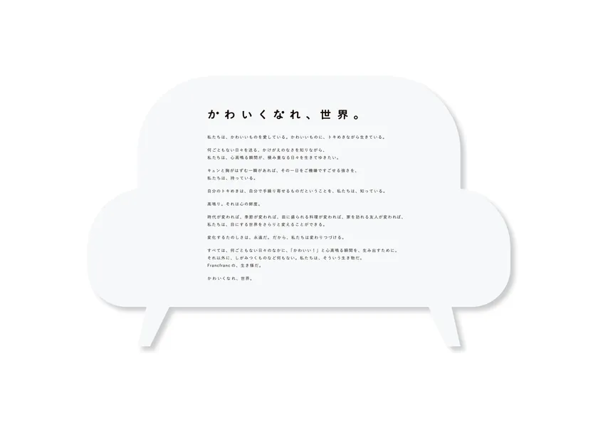 「かわいくなれ、世界。」は、インテリアショップの先駆けとして、常に新しいトレンドを牽引してきたFrancfrancが、これまでもこれからも心の高鳴りを創り上げてきた/いくという意思を込めたタグラインです。今後も移りゆく時代の中で、変わらない存在価値を世の中に発信していこうという、Francfrancのメッセージが込められています。