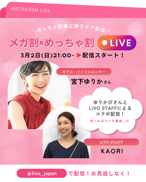 『メガ割×めっちゃ割』開催に伴い、LIVO STAFF×インフルエンサー・モデルのゆりかぴさんとのインスタライブが決定!