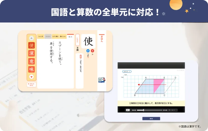 いずれも教科書に準拠した内容で、全単元に対応しているため、先生は授業の進度に合わせてご利用いただけます。一つのIDで国語(漢字)と算数のどちらも学習可能です。