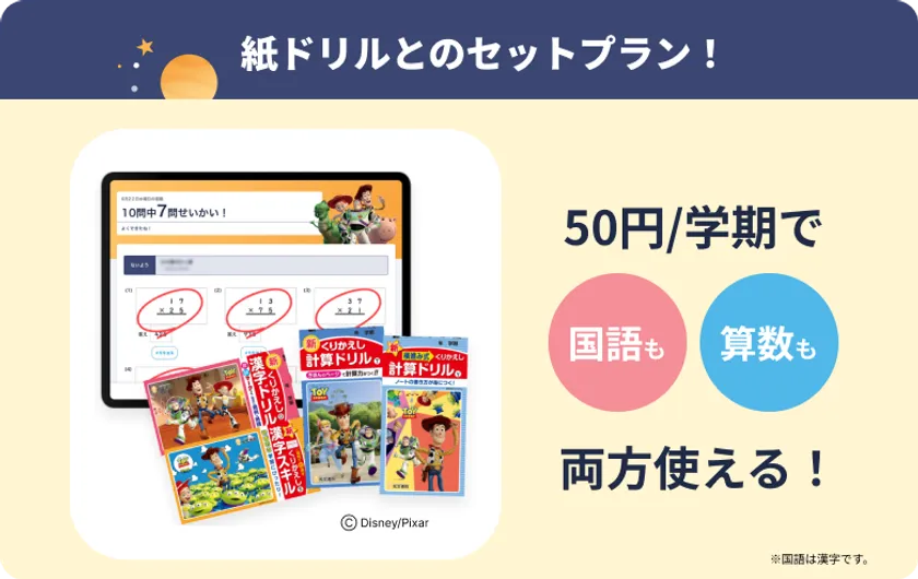 【学期50円で国語も算数も両方使える!紙ドリルとのセットプラン】
