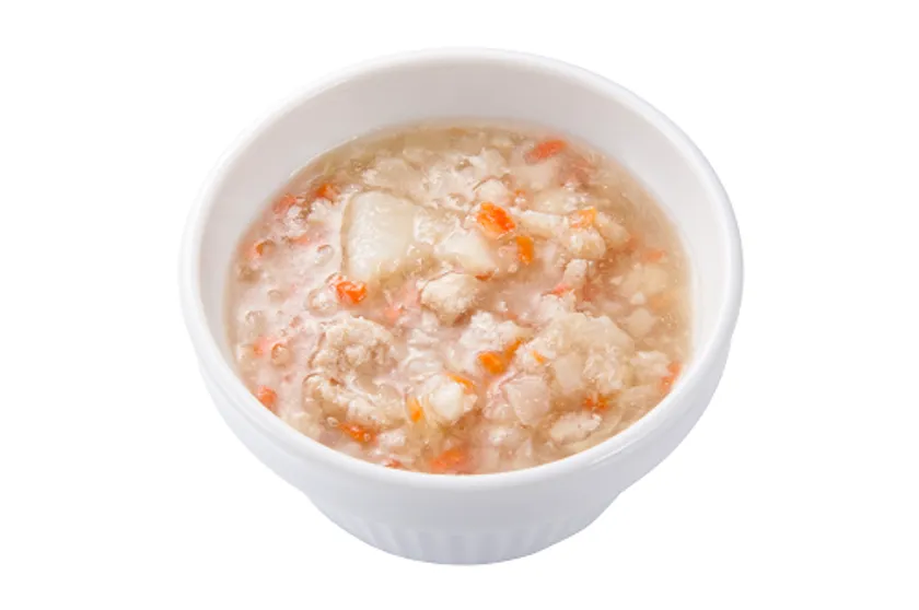 生姜風味の鶏そぼろと北海道産じゃがいもに加えて、キャベツやニンジンを鶏のお出汁でじっくり煮込みました。素材の味を活かしつつ、それぞれの具材は細かくカットしているのでワンちゃんも食べやすく仕上がっています。