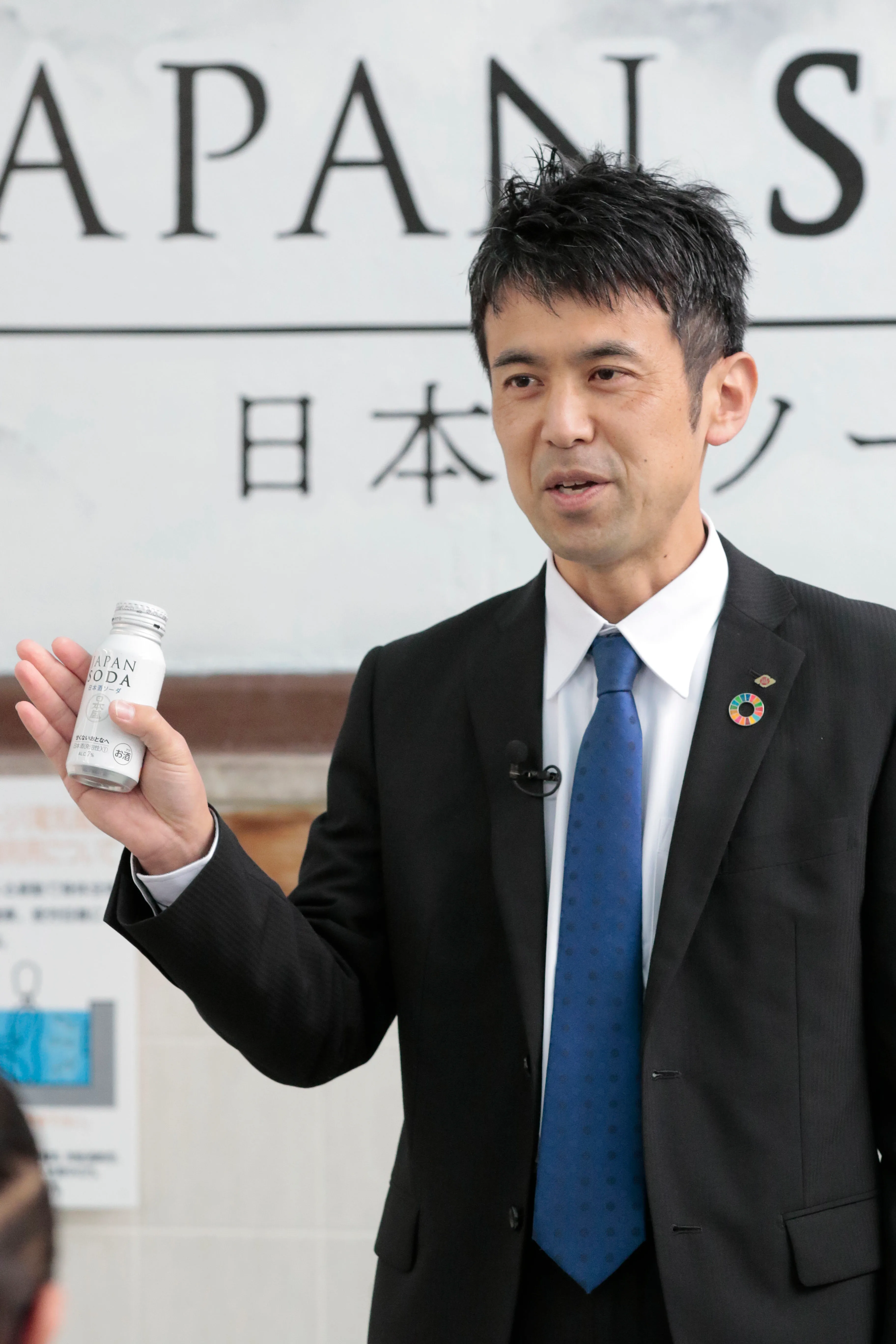 まずは、当社執行役員 営業本部長の松本栄一郎と、商品開発室課長・高野将彰よりご挨拶差し上げました。松本からは「日本盛は、地域に貢献できる事業をしようと青年実業家が発足した株式会社です。当時は今で言うベンチャー企業でして、300年、400年と長い歴史のある酒蔵が多い中、弊社は創業134年目となります。創業当時のチャレンジ精神を今も脈々と受け継いでおり、業界初の商品も多数生み出しております。テレビコマーシャルソングの放映や、化粧品業界への参入も弊社が業界初となっています。そして、本日発表の『JAPAN SODA』、この商品が日本酒業界の活性化に寄与すると確信しております」と、会社説明とともに新商品への意気込みを語りました。