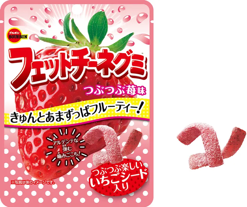 ブルボン、いちごシードでつぶつぶ食感が楽しい 「フェットチーネグミつぶつぶ苺味」を4月4日(火)に新発売!