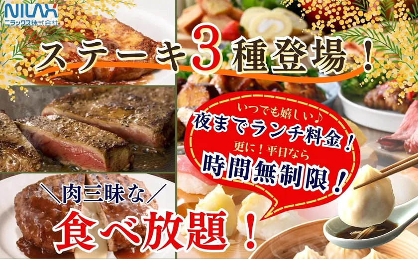 平日は時間無制限!更に夜まで“ランチ料金”で食べ放題! バラエティー豊かな『ニラックスブッフェ』14店舗にて 3種類の『ステーキ』が食べ放題で新登場