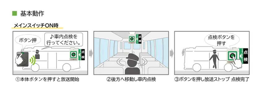 上記の操作を行わずにメインスイッチをOFFにした場合、車内点検を促す放送が再度メインスイッチをONにするまで車内外に流れ続けます。