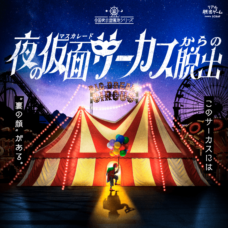 『夜の仮面(マスカレード)サーカスからの脱出』は、総動員数25万人以上を記録するリアル脱出ゲームの大人気シリーズ「全国夜の遊園地シリーズ」最新作。全国各地の夜の人気遊園地を貸し切り、開放的かつ幻想的な雰囲気の中、仕掛けられた謎や暗号を解き明かす体験型ゲーム・イベントです。