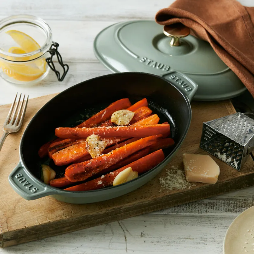 調理したらそのまま食卓にだせて、お皿要らず。浅型で取りやすく、食事の間も温かさを保ちます。