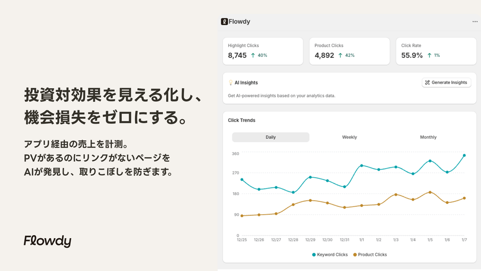 ユーザーがキーワードをクリックしてから7日以内に購入に至った売上を、「Flowdy経由の成果」として正確に計測・レポート化します。