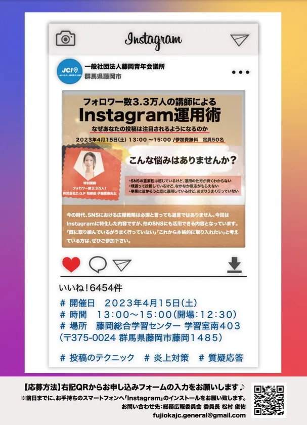 一般社団法人藤岡青年会議所(群馬県藤岡市、2023年度総務広報委員長 松村 俊佑)は、地域のSNS発信力の向上を目的にInstagramの無料セミナーを開催致します。