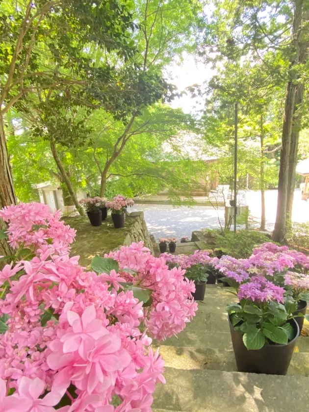 昨年、アジサイを楽しみに来られる参拝者の皆様になんとか楽しんでいただこうと、それまでは地植えしていたアジサイをテスト的に鉢植えにし並べてみたところ、鹿や猪による被害もなく、6月初旬から7月初旬まで美しいアジサイを楽しんでいただくことができました。