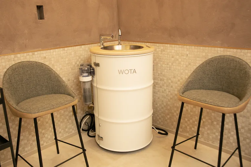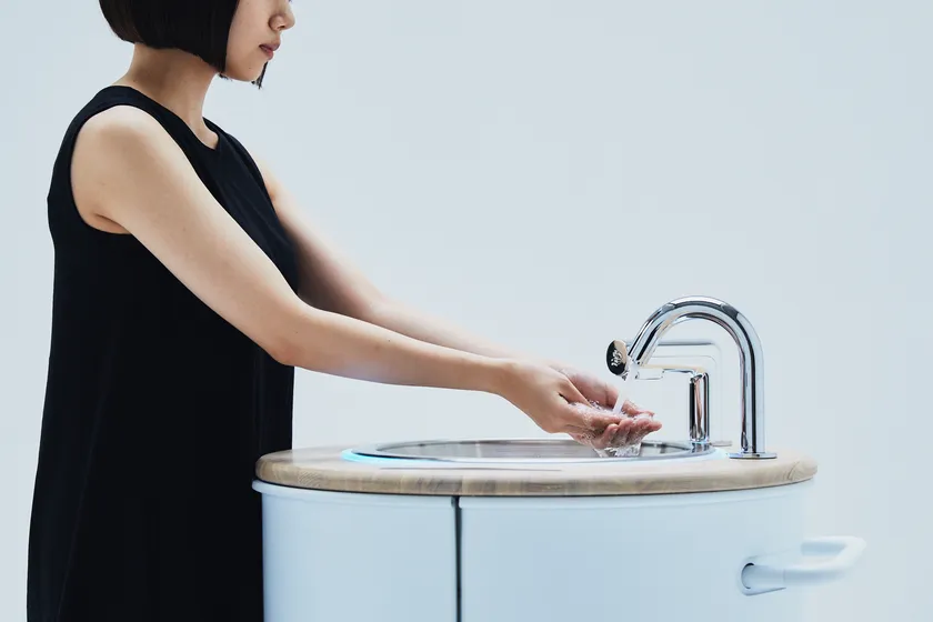 水循環型手洗いスタンド「WOSH」は、水道のない場所でも20リットルの水と電源さえあれば、使用した水の98%以上を再生し、繰り返し利用できる商品です。軟水によるやさしい肌触りや、スマートフォン除菌機能によって、安心で心地の良い手洗い体験を味わうことができます。