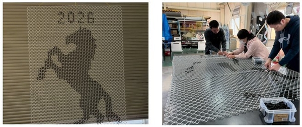 令和8年の干支である「午」を描いたグラフィックフェンスを市役所1階ロビーに展示します。これは11月に開催された工場を一般開放するイベント、オープンファクトリー「こーばへ行こう!」において、共和鋼業株式会社のワークショップ参加者が金網のフェンスに一つずつチューブを取り付けて完成させたものです。