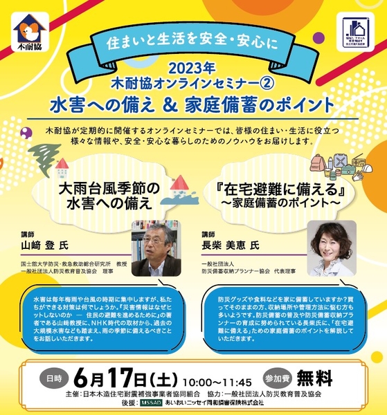 今回は、これからシーズンを迎える梅雨・台風で危惧される水害への備えを山﨑教授に、「在宅避難に備える」ための家庭備蓄のポイントを長柴氏にご講演していただきます。