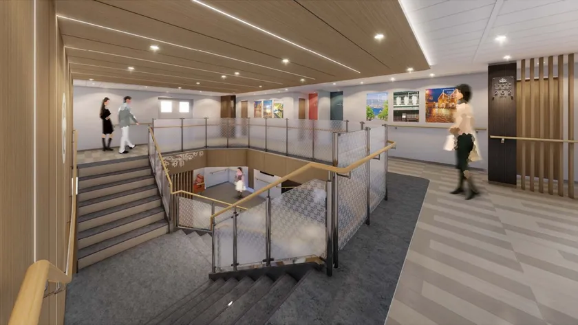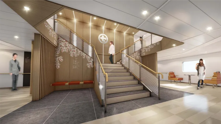 船の中心に配置されたメイン階段。開放的な空間は本船の象徴としてお客様の心に深く刻まれます。