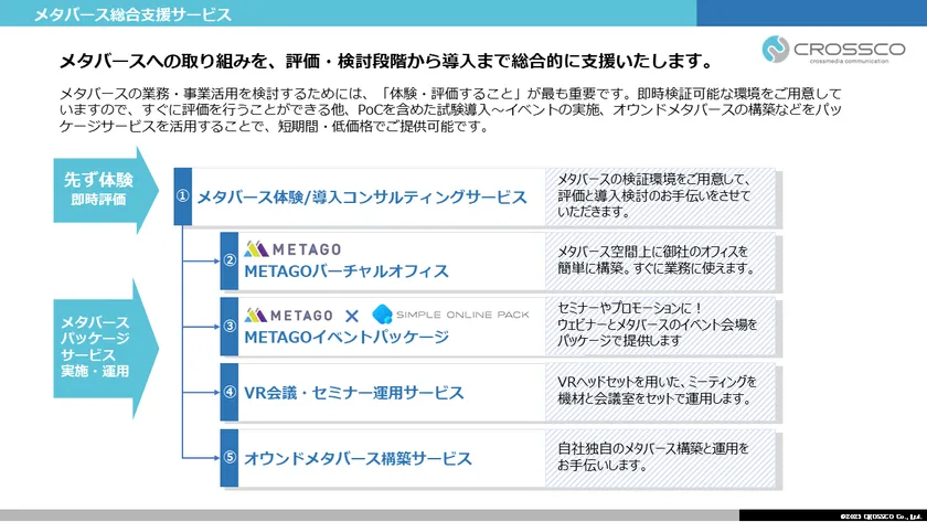 クロスコ株式会社は、2014年よりVRのコンテンツ制作サービスを開始し、2020年からはVRを用いた会議やイベントの実施・運用・コンテンツ開発などの提供を行い、多くの企業のVR導入の支援を行ってまいりました。2022年にはメタバースポータルサービス「METAGO」の提供も開始し、メタバースの企業導入を低価格で実現しております。