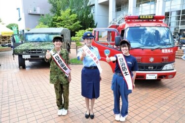 今回は、毎回ご出演いただいている尾張旭市内3つの中学校(西中学校・旭中学校・東中学校)吹奏楽部の生徒さんによる演奏会をはじめ、名古屋産業大学・名古屋経営短期大学の学生による模擬店、名古屋産業大学・名古屋経営短期大学・菊華高等学校や菊武ビジネス専門学校軽音部の学生・生徒による姉妹校合同ライブ、名古屋産業大学・名古屋経営短期大学のダンスサークルの学生によるダンスパフォーマンスのほか、新たな企画として「みんなの街を守る はたらくクルマ大集合!!」をテーマに、愛知県守山警察署・尾張旭市消防署・陸上自衛隊守山駐屯地のご協力のもと、白バイ・パトカー・機動隊で活躍するウニモグ高性能救助車や消防ポンプ自動車、人員等輸送用の高機動車の特殊車両が、メイン会場にずらりと並び、普段なかなか見ることのない光景に、多くの方が興味深々に見入っていました。制服試着等の広報ブースでは、それぞれの制服を着て、特殊車両を背景に写真撮影をするなど、お子様らの憧れをかなえていました。