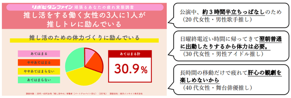 調査を通して、日々のお仕事に加え、プライベートで楽しむ「推し活」の中にも“疲労”という課題があることが推察されます。「推し活」に向けての体力作り「推しトレ」だけでなく、推し活で疲れた体には、疲労回復、体力・身体抵抗力又は集中力の維持・改善に役立つリポビタンファインがおすすめです。