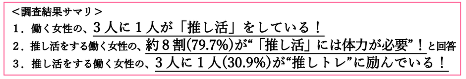 第四弾となる今回は、20代から60代の女性有職者を対象に、推し活実態と体力に関する調査を実施しました。調査の結果、「推し活」に取り組む働く女性の約8割が「推し活」には体力が必要と考えていると共に、3人に1人が「推し活」のために、体力づくりに励んでいるという実態が明らかとなりました。