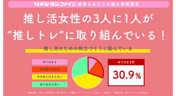 また、「推し活」に取り組む働く女性の30.9%、実に3人に1人が「『推し活』のために、体力づくりに励んでいる」にあてはまると回答しました(「あてはまる」、「ややあてはまる」と答えた方の合計)。
