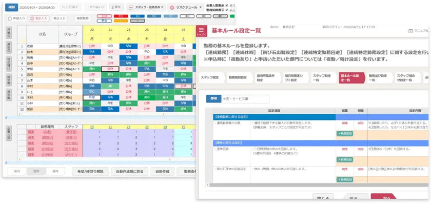 「勤務シフト作成お助けマン」は、シフト表の自動作成・管理ができるクラウドサービスです。スタッフの希望や勤務条件を反映したシフト表を自動で作成することができ、法令遵守や働きやすさを考慮したシフト表を、誰でも簡単に作成することができます。