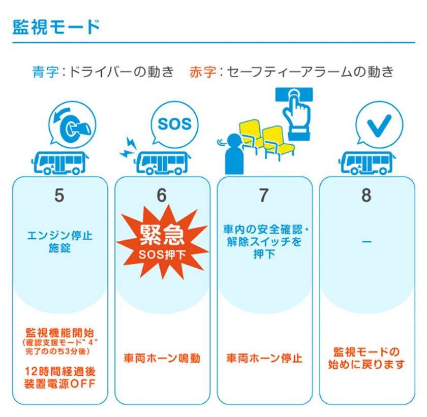 車内確認を促すボイスアラームは、車内後方の「解除スイッチ」を押した後に降車ドア付近の「緊急SOSボタン」を押すことで止まるWチェック機能を採用しました。車内後方スイッチ押下までの往路、並びに降車ドア付近のボタン押下まで一連の往復確認を促すことで、より確認精度を向上させ、ヒューマンエラーを抑制します。