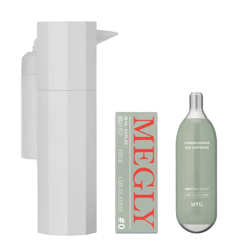 デバイス・めぐり導入液(1本)・炭酸ガスカートリッジ(1本)が含まれる、「MEGLY」を初めてお使いいただく方用のキットです。同梱されている消耗品のみで、約4~5週間※3のご使用目安です。