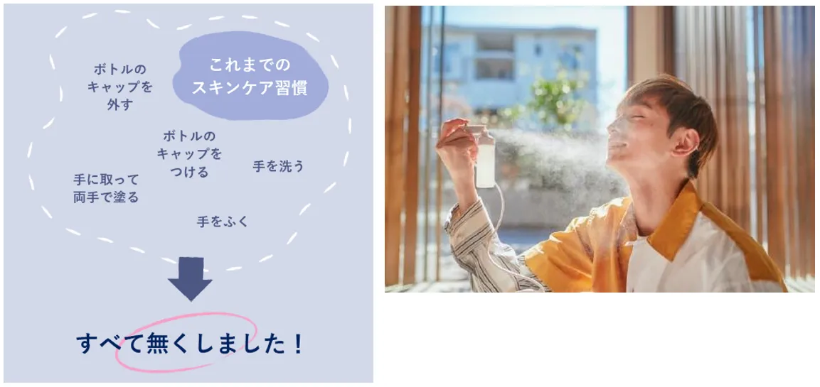 ・片手で吹きかけるだけのデバイスによって、これまで当たり前だったスキンケア行動をすべて無くしました。