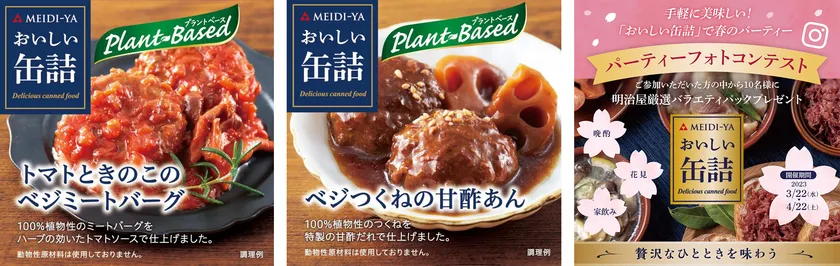 株式会社明治屋(本社:東京都中央区、代表取締役社長:磯野 太市郎)は、『おいしい缶詰』シリーズから「トマトときのこのベジミートバーグ」と「ベジつくねの甘酢あん」のプラントベース商品2アイテムを2023年2月23日に発売いたしました。この発売を記念して、「おいしい缶詰で春のパーティーフォトコンテスト」を開催いたします。