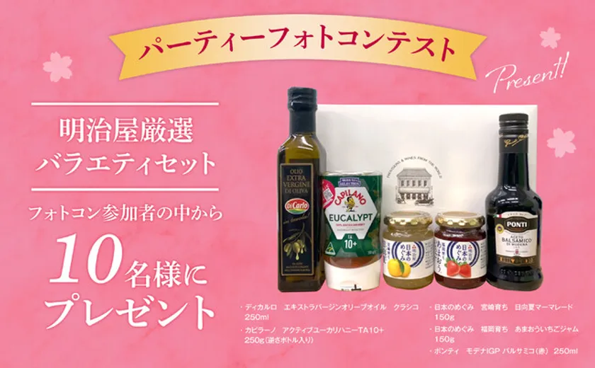 明治屋の公式Instagramアカウントをフォローし、「おいしい缶詰」シリーズで楽しむ「春のパーティー」写真を #おいしい缶詰で春のパーティー #明治屋 をつけてください。投稿者の中から、10名様に「明治屋厳選バラエティセット」をプレゼントいたします。みなさまの「おいしい缶詰」を使ったお花見あるいは家飲みなどでの春のパーティーの楽しみ方や、アレンジレシピなどの写真を、ふるってご応募ください。