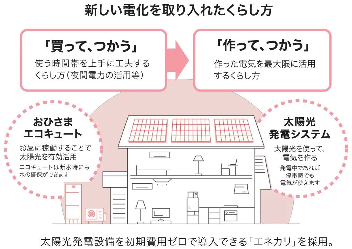 ■「おひさまエコキュート」を採用。大気熱と太陽光発電により昼間にお湯を沸かし、光熱費を削減。