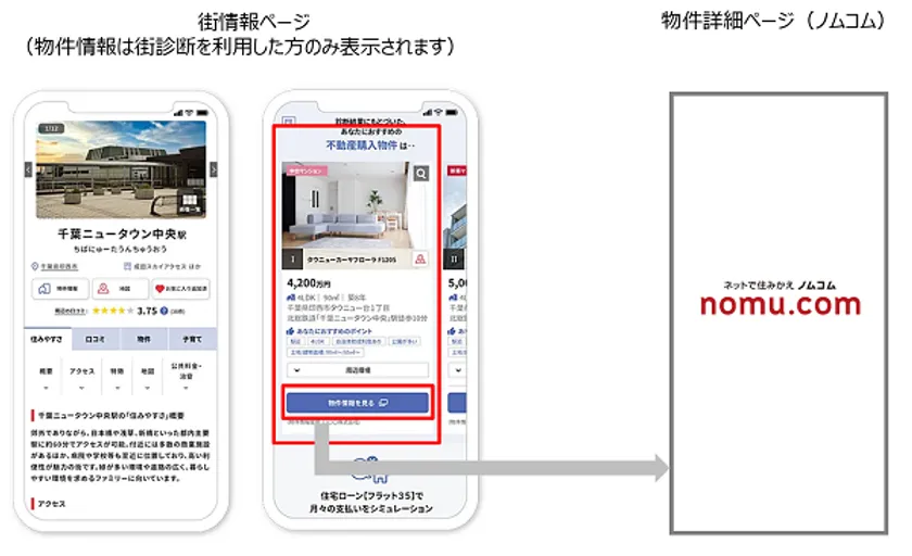 今回の野村不動産ソリューションズの物件情報の掲載により、「物件レコメンド」機能は、「街診断」を利用したお客さまに対し、より多くの物件の中からご提案することが可能となります。野村不動産ソリューションズが提供する物件情報についてもっと詳しく知りたい場合は、街情報ページ内にある「物件情報を見る」ボタンをクリックすることにより、野村不動産ソリューションズが運営する不動産情報サイト「ノムコム」内で、より詳細をご確認いただけます。