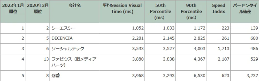 表示速度ランキングでは、シーエスシーが表示速度1,052msでトップとなりました。続く2位は2,281msでDECENCIA、3位は3,593msでソーシャルテックがランクインしました。売上高ランキングトップのオルビスは、表示速度が7,555msで表示速度は16位と、前回の49位から大幅にランクアップしました。