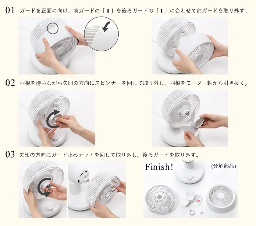 工具不要で簡単に分解・組み立てができる「洗えるサーキュレーターシリーズ」は、前面ガードや羽根、背面ガードを水で丸洗いでき、いつでも清潔にご使用いただけます。新商品は取り外し方法を一部見直すことで、より分解・組み立てしやすくなりました。