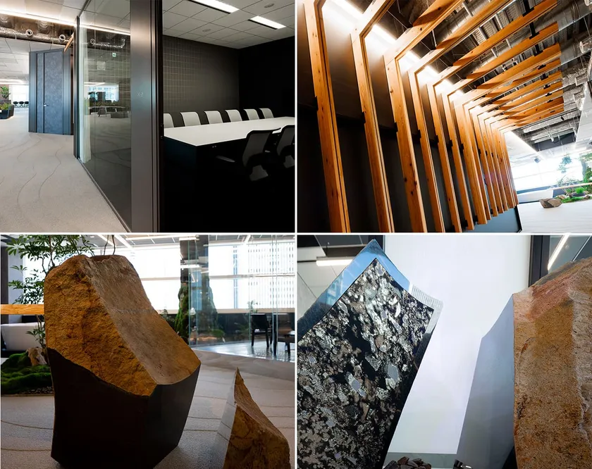 ・下段:オフィスの各所に配置された石は、自然環境への影響に配慮しながら採石されたもの