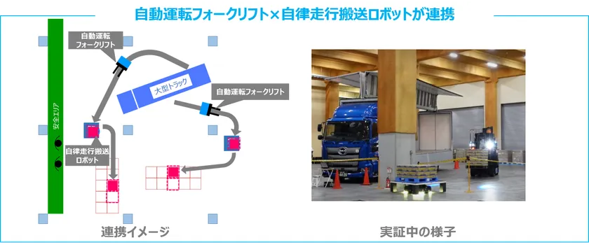 ●自律走行搬送ロボットを使い、自動運転フォークリフトと連携した荷捌き場での荷積み/荷下ろしを実証
