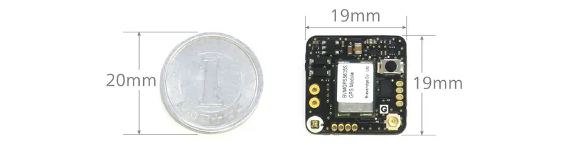 19×19mmの外寸は1円玉の直径よりも小さなサイズ。従来製品「BVRPA/BVRPN」と比べて面積比1/4以下。厚み5.0mm、重量わずか1.6g(※アンテナ、電源線重量除く)。