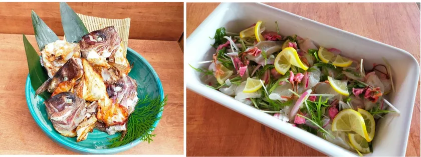 左)桜鯛カマの塩焼き/右)桜鯛のマリネ