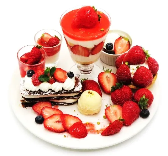 いちごは糖度が高く甘みが強い茨城県産の「やよいひめ」を主に使用し、いちごのミルフィーユやいちごのタルトなど、旬のいちごをたっぷりお楽しみいただけるプレートです。