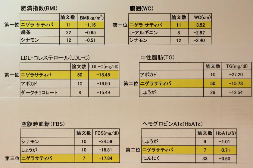 その結果、ニゲラは肥満指数、腹囲、LDLコレステロール値を減らす効果が第一位、ヘモグロビンA1c値、中性脂肪値を減らす効果が第二位、空腹時血糖値を減らす効果が第三位で、高血圧(第七位)を除くメタボ要因に大きな効果をもたらします。