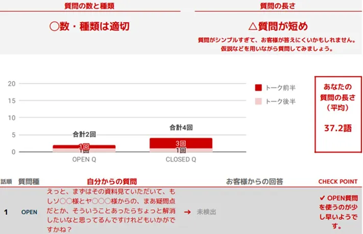 任意の音声ファイルを選択して、営業トークの客観的な分析レポートを作成できます。20,000件以上のデータで学習したAIが通話内容を数値やグラフで可視化し、改善ポイントを提案します。例えば、成約率の高い優秀な営業担当者のノウハウを蓄積・共有したい、OJTによらず科学的なデータに基づきメンバーの成長を促したい、新任者に質の高い営業トークを学ばせ短期間で育成したいといったニーズに対応し、勝ちパターンを全員が身につけることで組織としての営業力を向上できます。